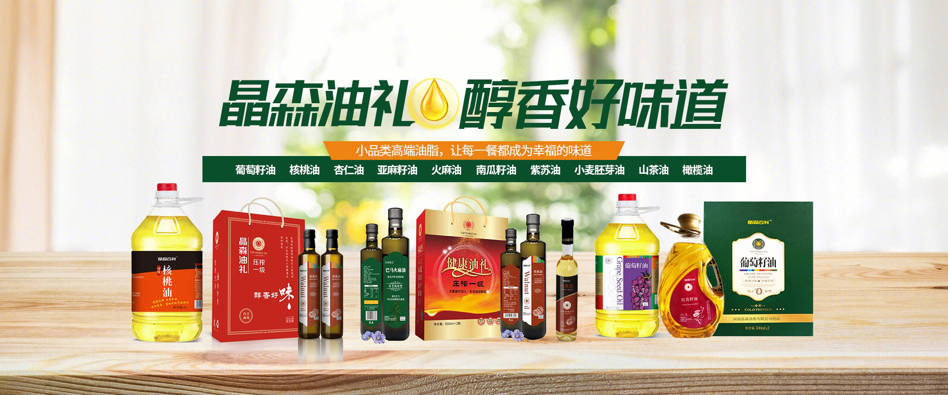 生產經營葡萄籽油、核桃油、山茶油、亞麻籽油紫蘇籽油、杏仁油、小麥胚芽油、南瓜籽油、火麻籽油、橄欖油等高端食用油等